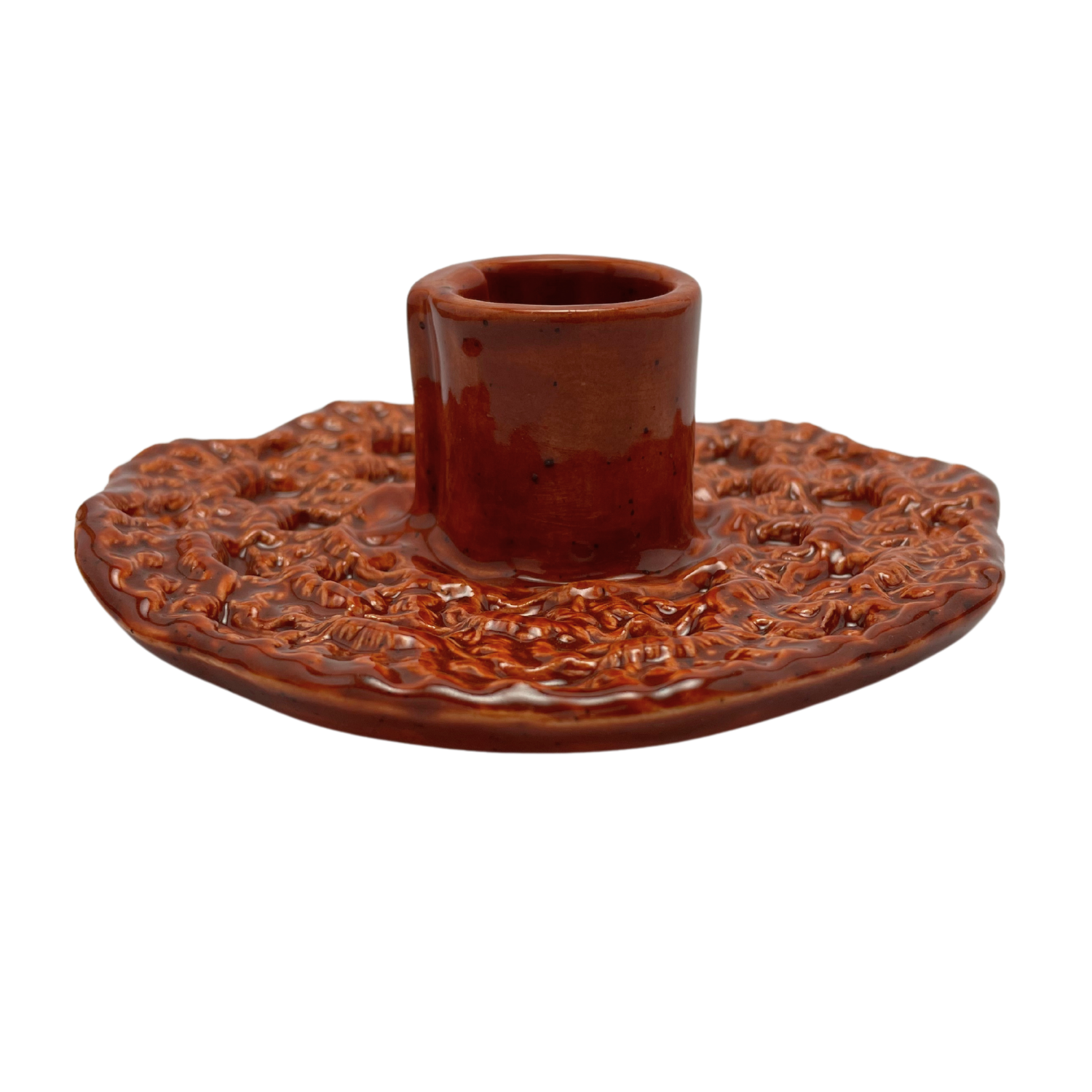 Handmade, one-of-a-kind crochet-style candle holder. Crafted from porcelain-like stoneware clay, this deep burnt orange candlestick holder is designed to accommodate various candle sizes, including standard tapered candles and Shabbat candles.