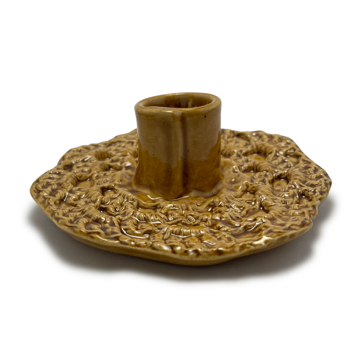Handmade, one-of-a-kind crochet-style candle holder. Crafted from porcelain-like stoneware clay, this mustard yellow candlestick holder is designed to accommodate various candle sizes, including standard tapered candles and Shabbat candles.
