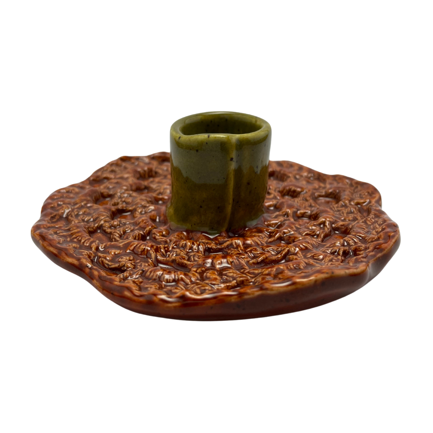 Handmade, one-of-a-kind crochet-style candle holder. Crafted from porcelain-like stoneware clay, this deep burnt orange and olive green candlestick holder is designed to accommodate various candle sizes, including standard tapered candles and Shabbat candles.