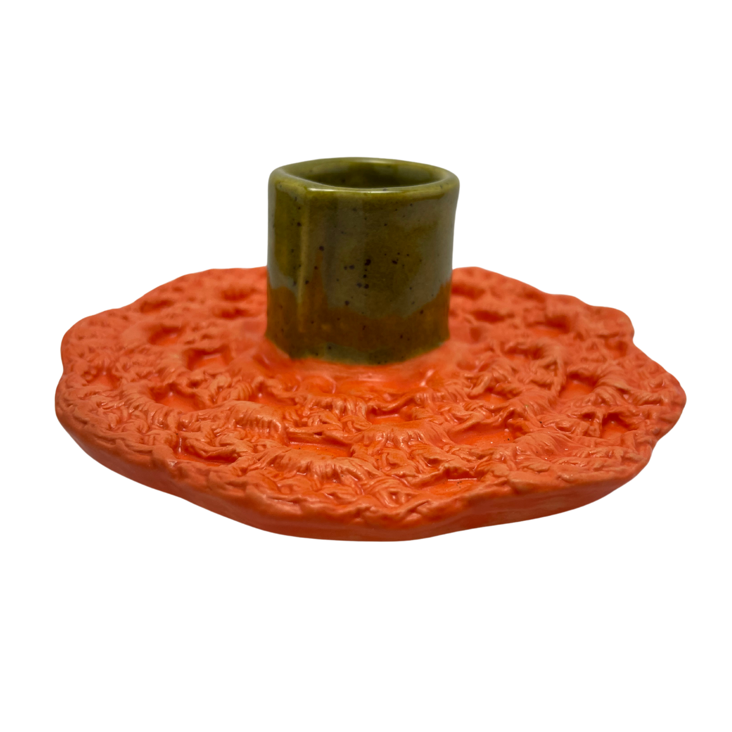 Handmade, one-of-a-kind crochet-style candle holder. Crafted from porcelain-like stoneware clay, this orange and green candlestick holder is designed to accommodate various candle sizes, including standard tapered candles and Shabbat candles.