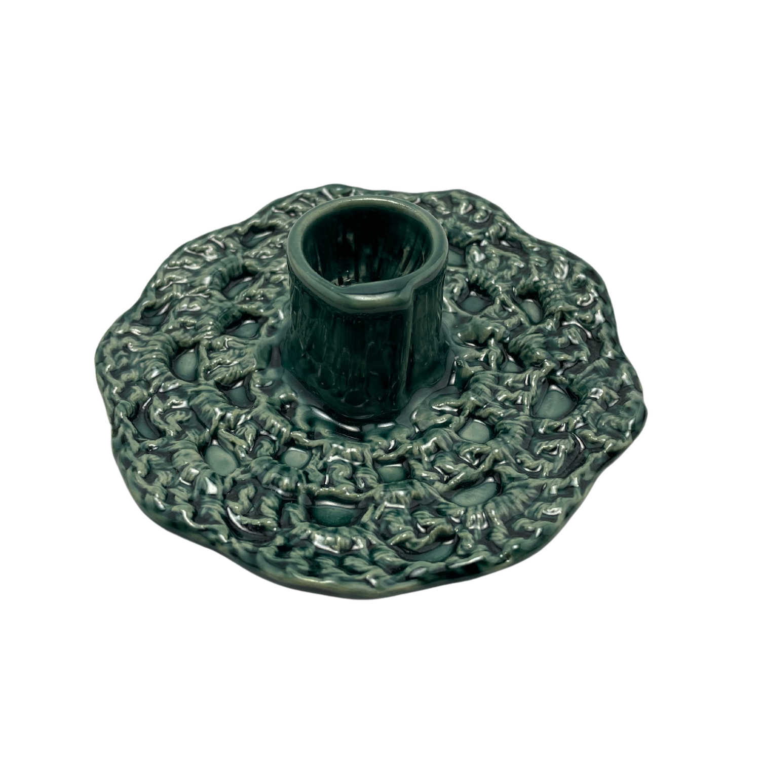 Handmade, one-of-a-kind crochet-style candle holder. Crafted from porcelain-like stoneware clay, this teal candlestick holder is designed to accommodate various candle sizes, including standard tapered candles and Shabbat candles.