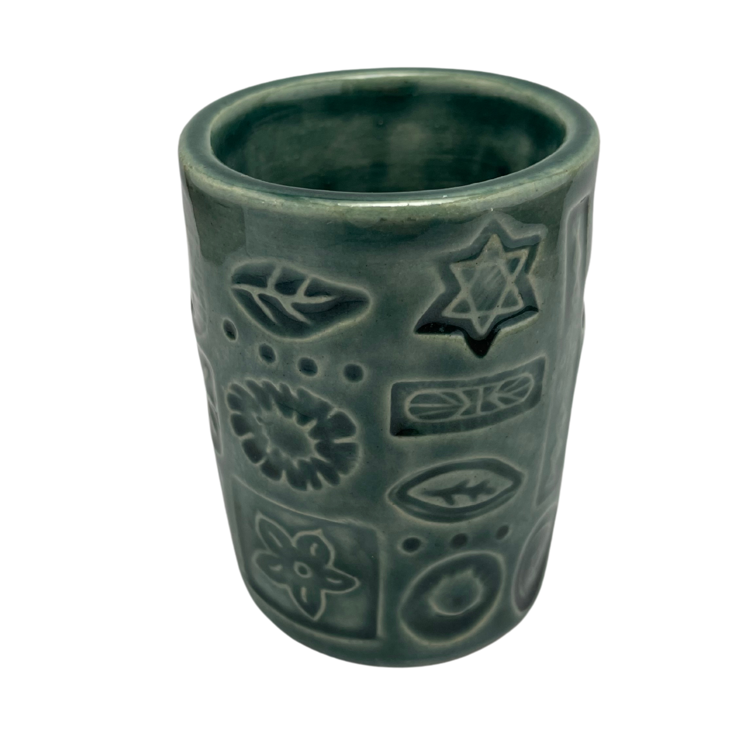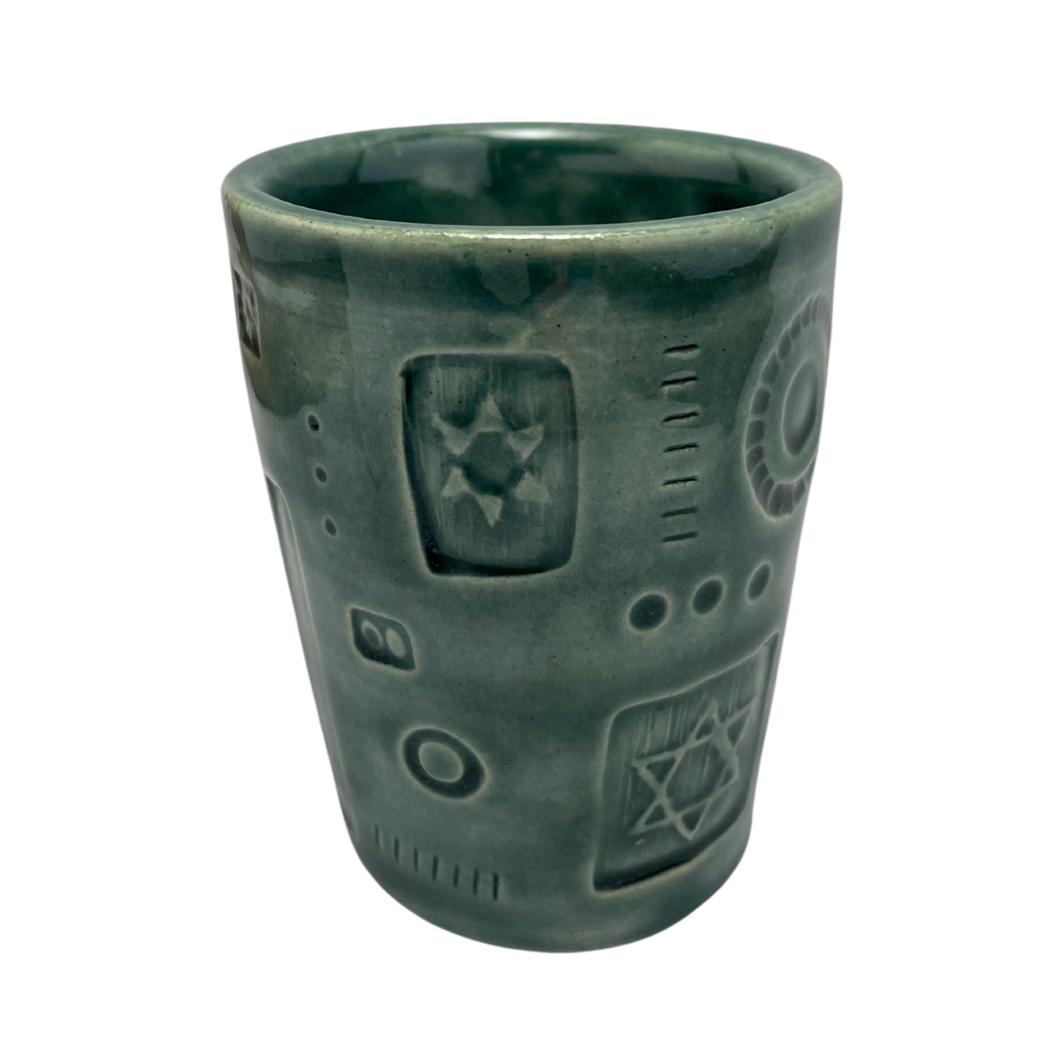 Hand-painted, one-of-a-kind Kiddush Cup featuring a distinct surface adorned with Star of David designs. Each ornate cup is crafted to enrich Shabbat through the practice of beautifying Jewish observances.