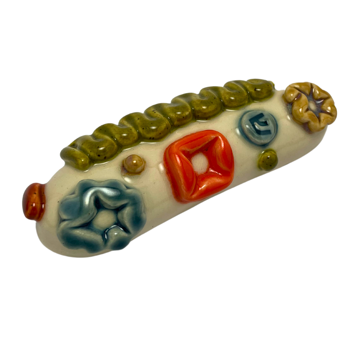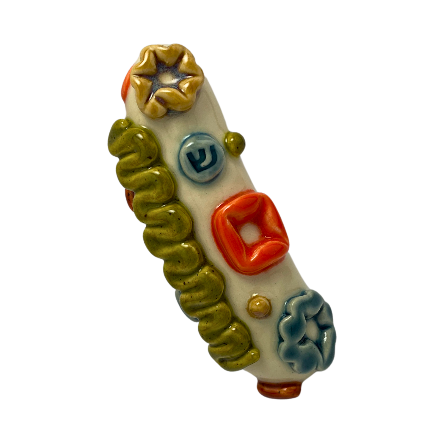 Handcrafted, one-of-a-kind mezuzah featuring a distinct surface adorned with elaborate designs. Each mezuzah is intricately crafted to elevate your rituals through the practice of beautifying Jewish observances.