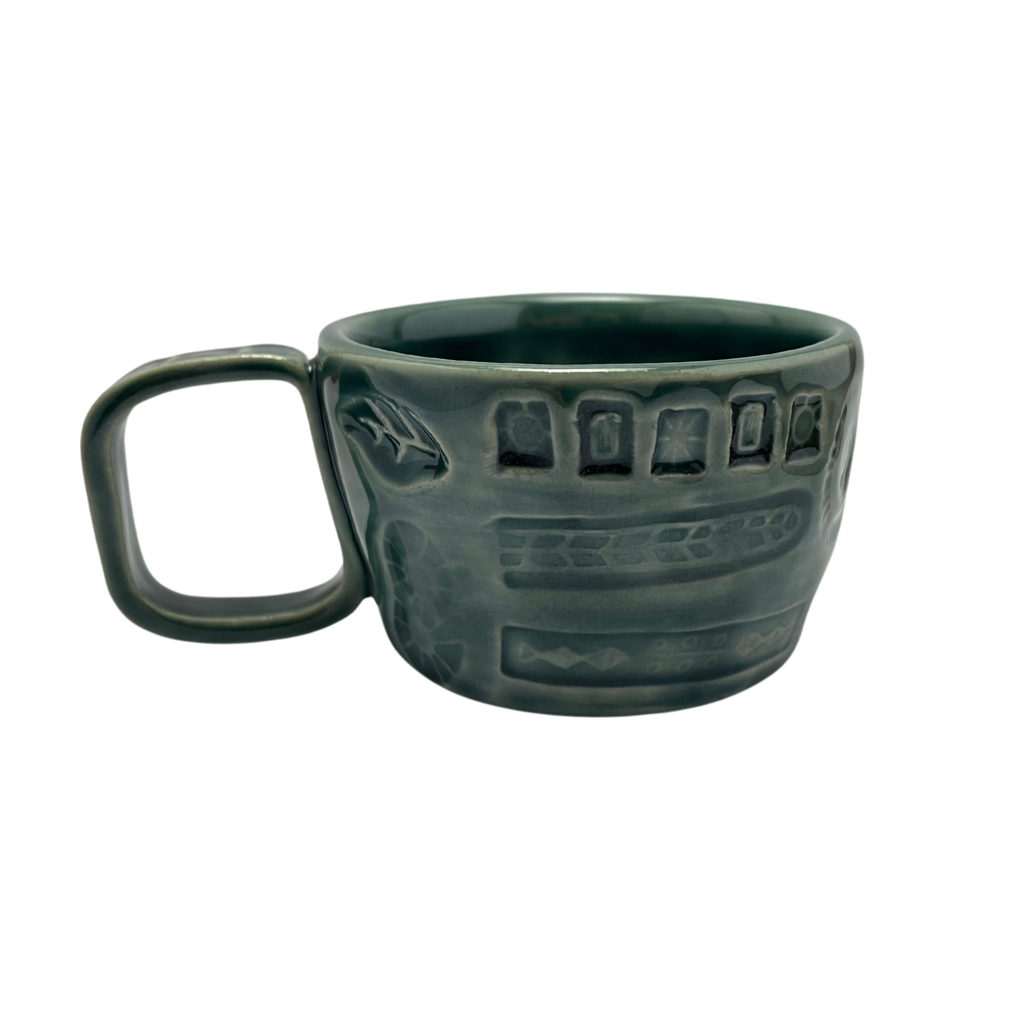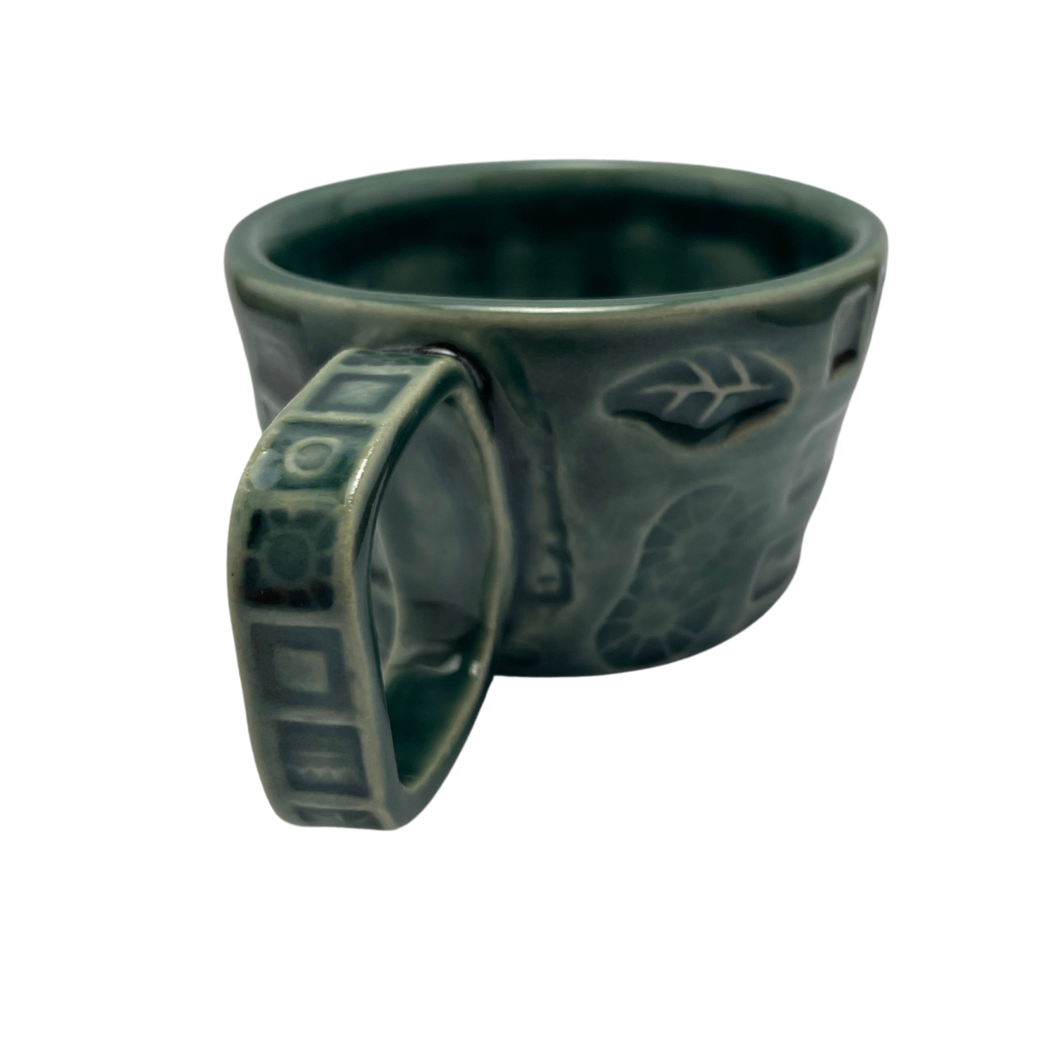 Stoneware mug handmade in California. Each mug features distinctive, meticulously handcrafted elements, ensuring individuality in every piece.