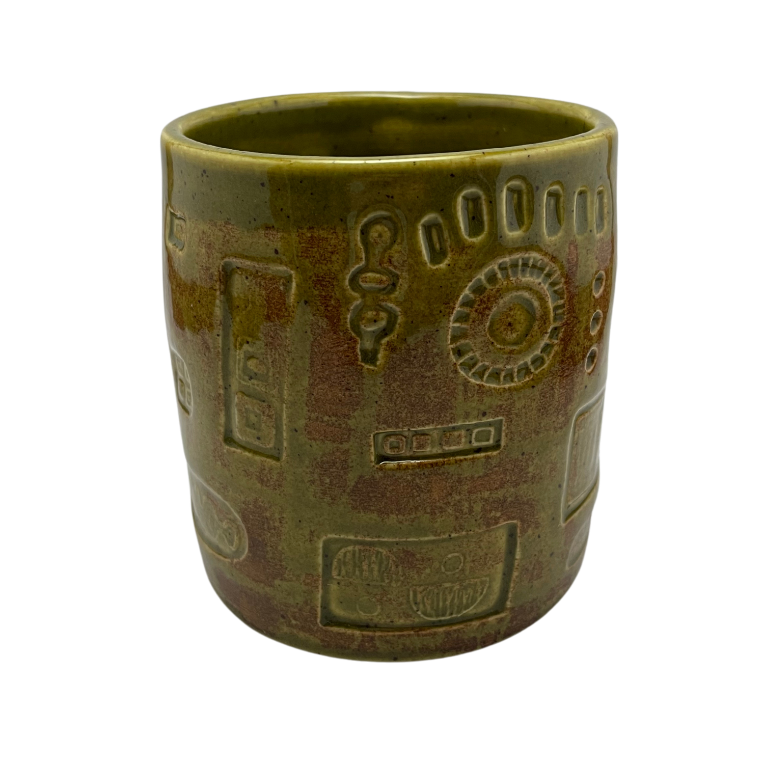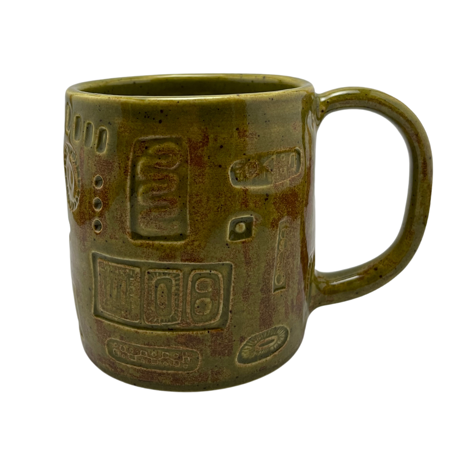 Large stoneware mug, handmade in California. Each mug features distinctive, meticulously handcrafted elements, ensuring individuality in every piece. This robust stoneware mug, weighing around one pound, embodies durability and provides satisfying comfort in your hand.