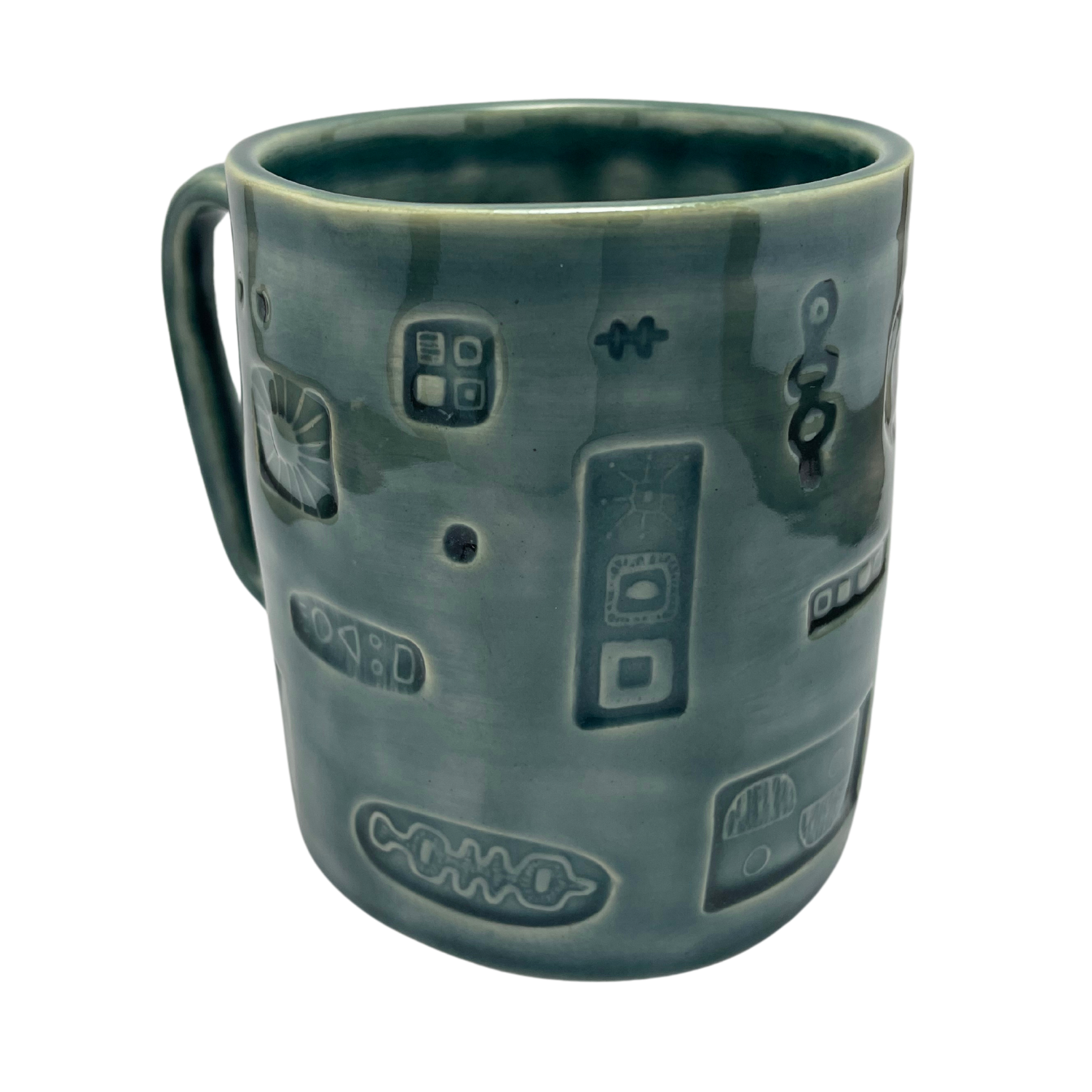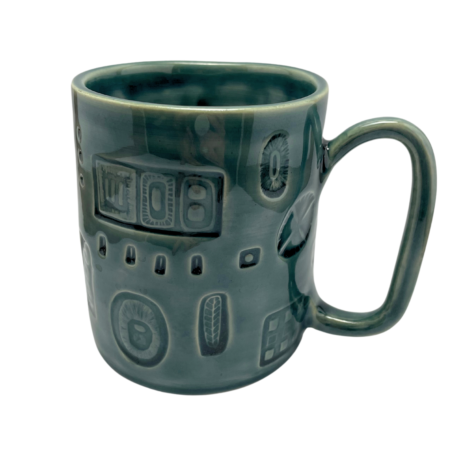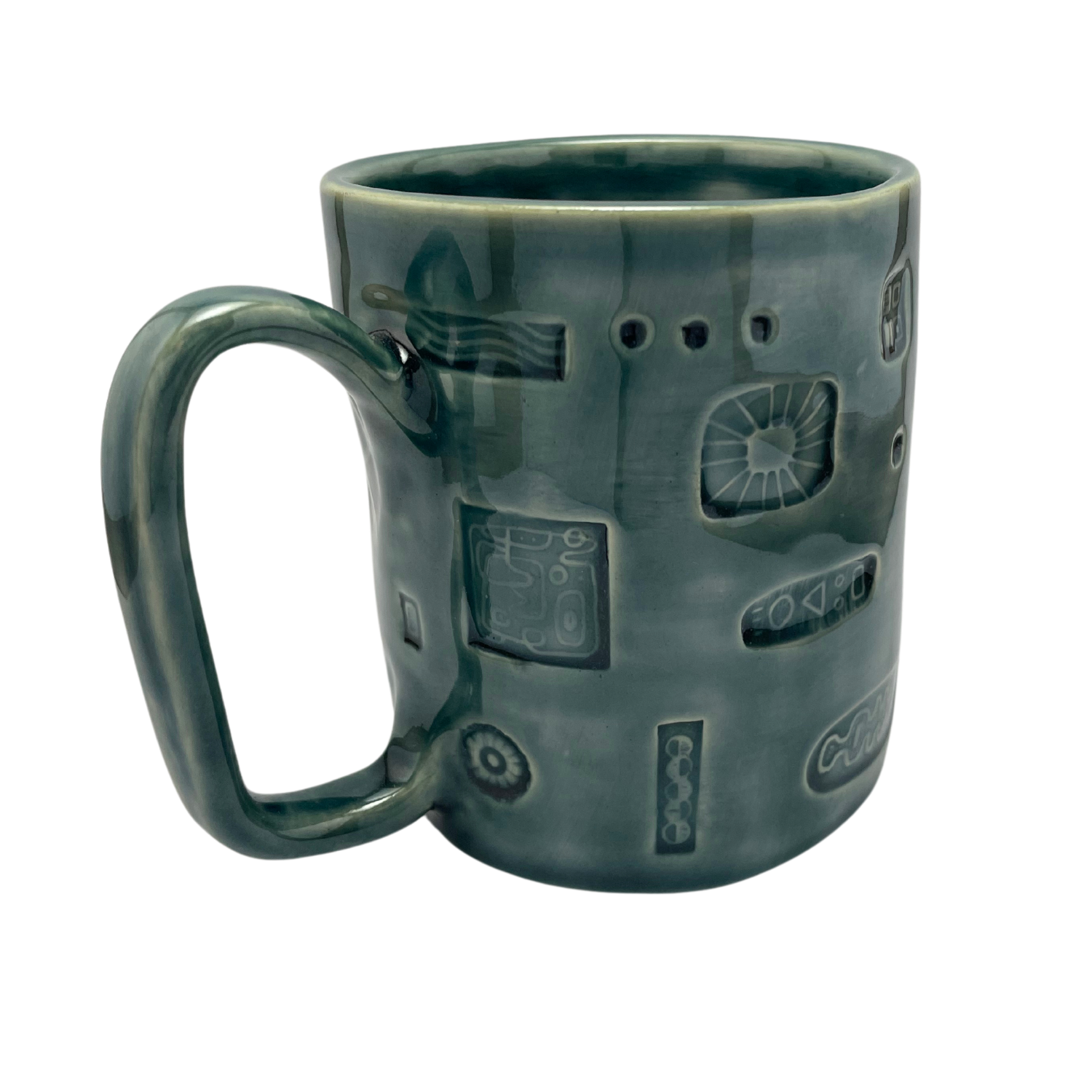 Large stoneware mug, handmade in California. Each mug features distinctive, meticulously handcrafted elements, ensuring individuality in every piece. This robust stoneware mug, weighing around one pound, embodies durability and provides satisfying comfort in your hand.