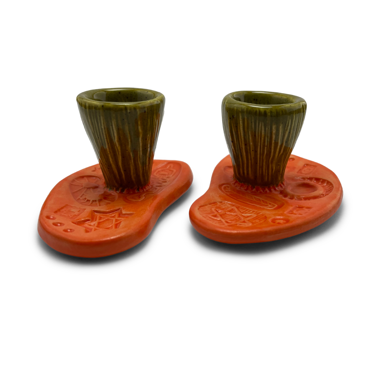 Handmade, one-of-a-kind Shabbat candle holders in orange and green. Crafted from porcelain-like stoneware clay, the collection of Shabbat candlestick holders is thoughtfully designed to work well together, offering a cohesive aesthetic.