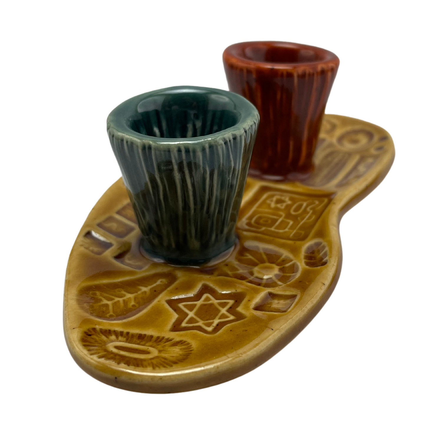 The final step involves kiln firing at approximately 2000°F, which enhances the depth of the glaze and reinforces the ceramic. This meticulous process results in a beautifully crafted and durable Shabbat candle holder set.