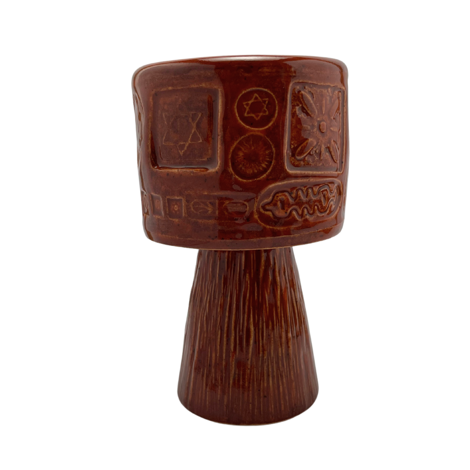 Hand-painted, one-of-a-kind tall Kiddush Cup featuring a distinct surface adorned with Star of David designs. Each ornate cup is crafted to enrich Shabbat through the practice of beautifying Jewish observances. Inspired by mid-century Judaica, this Kiddush cup features a stylized cylindrical shape and a cone base, offering a comfortable and elegant grip.