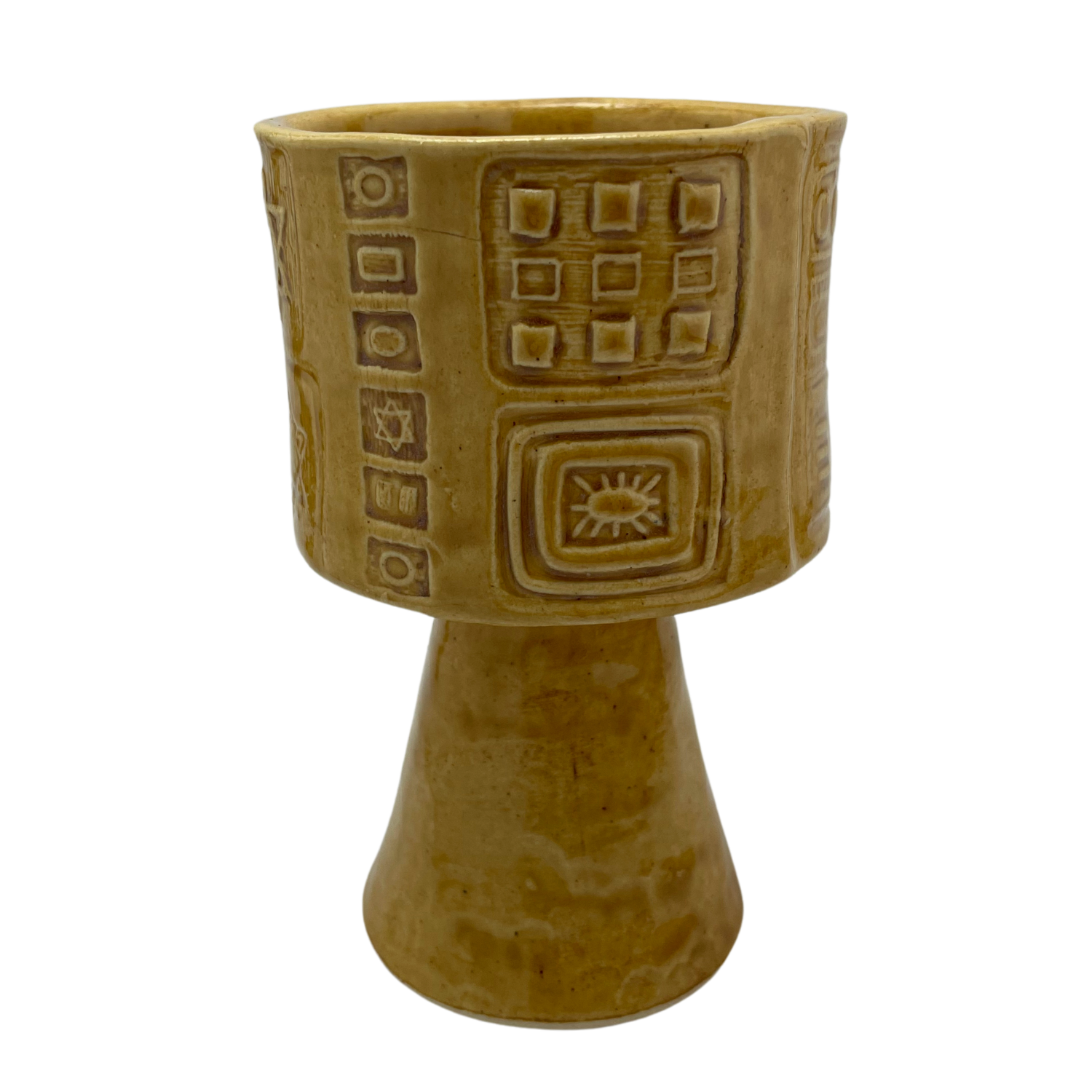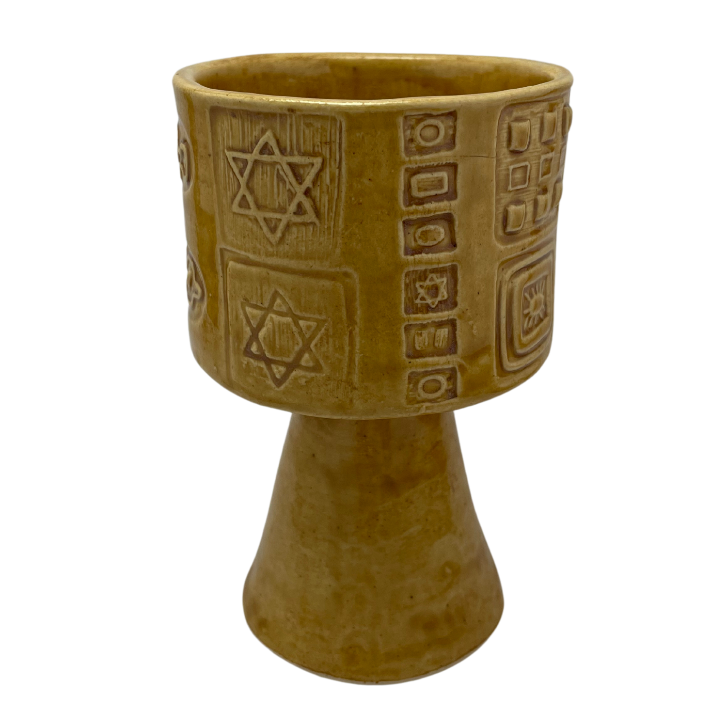 Hand-painted, one-of-a-kind tall Kiddush Cup featuring a distinct surface adorned with Star of David designs. Each ornate cup is crafted to enrich Shabbat through the practice of beautifying Jewish observances. Inspired by mid-century Judaica, this Kiddush cup features a stylized cylindrical shape and a cone base, offering a comfortable and elegant grip.
