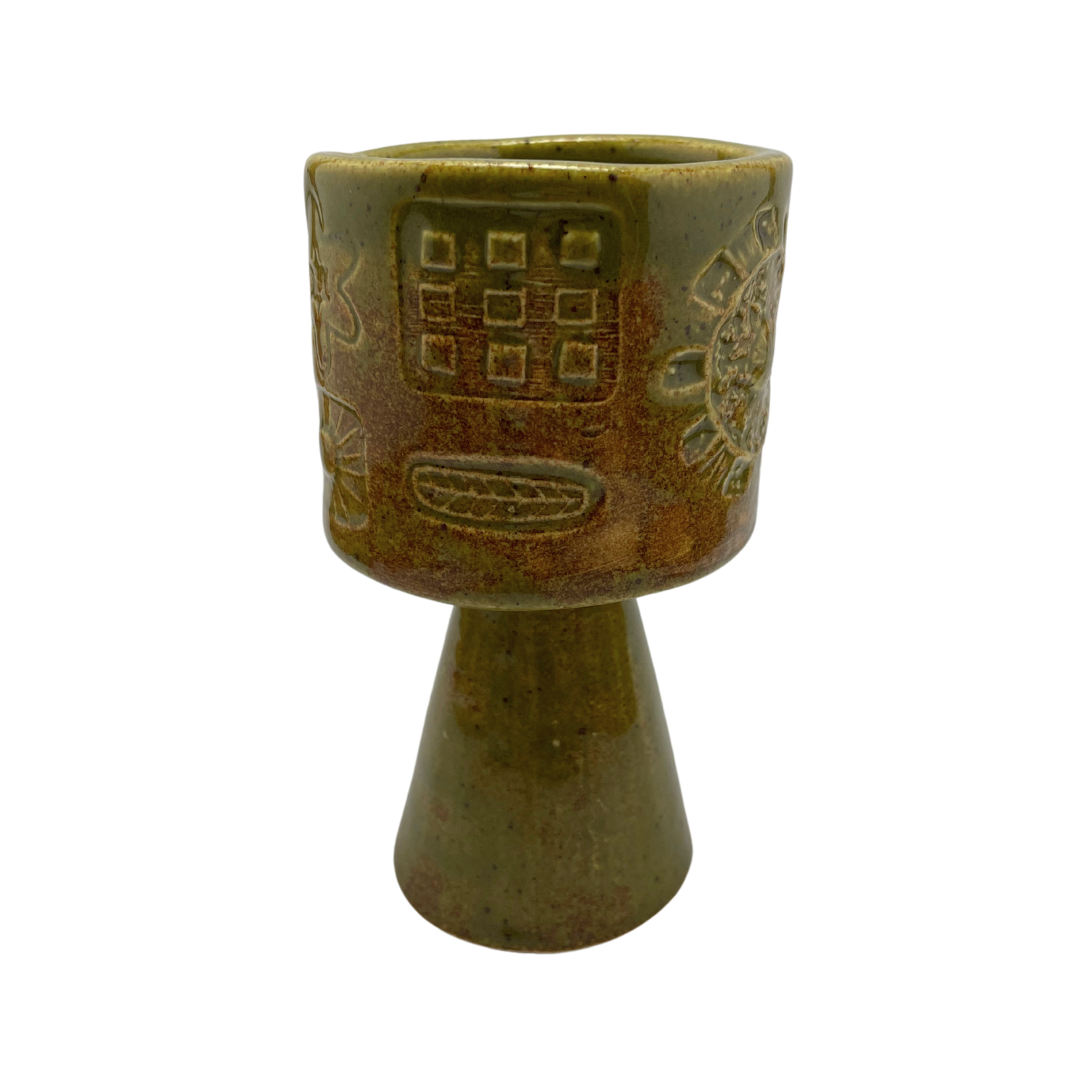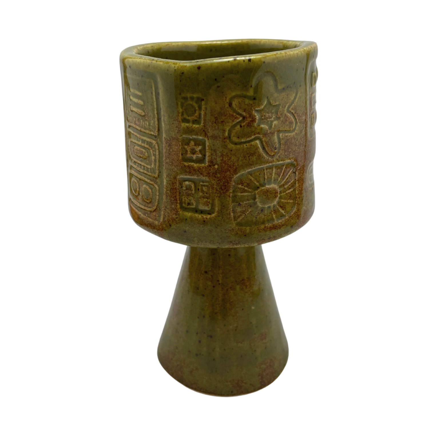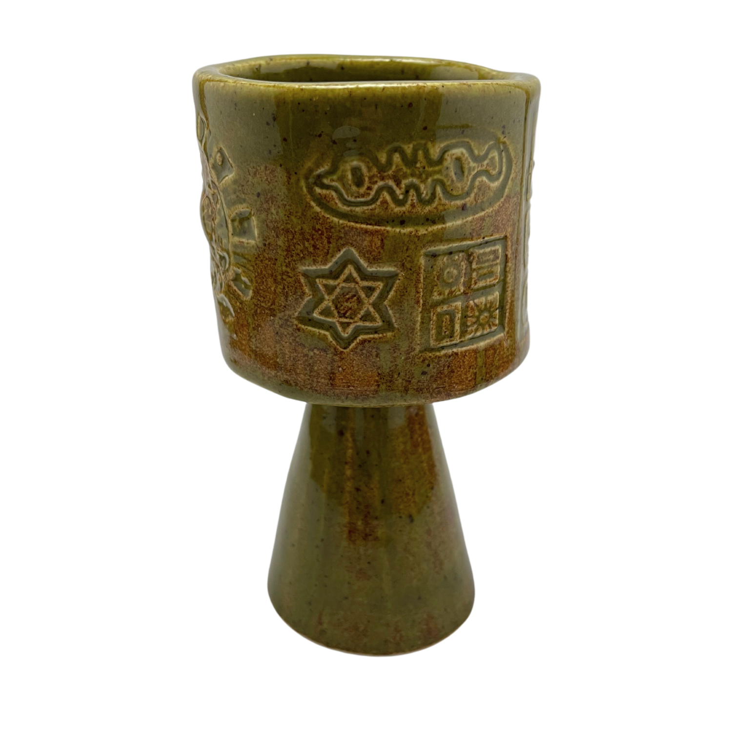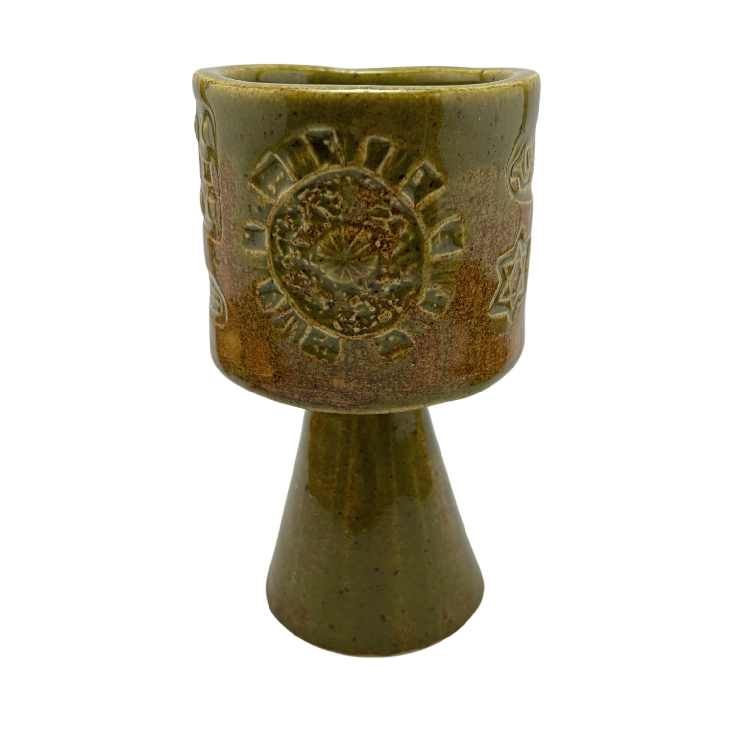 Hand-painted, one-of-a-kind tall Kiddush Cup featuring a distinct surface adorned with Star of David designs. Each ornate cup is crafted to enrich Shabbat through the practice of beautifying Jewish observances. Inspired by mid-century Judaica, this Kiddush cup features a stylized cylindrical shape and a cone base, offering a comfortable and elegant grip.