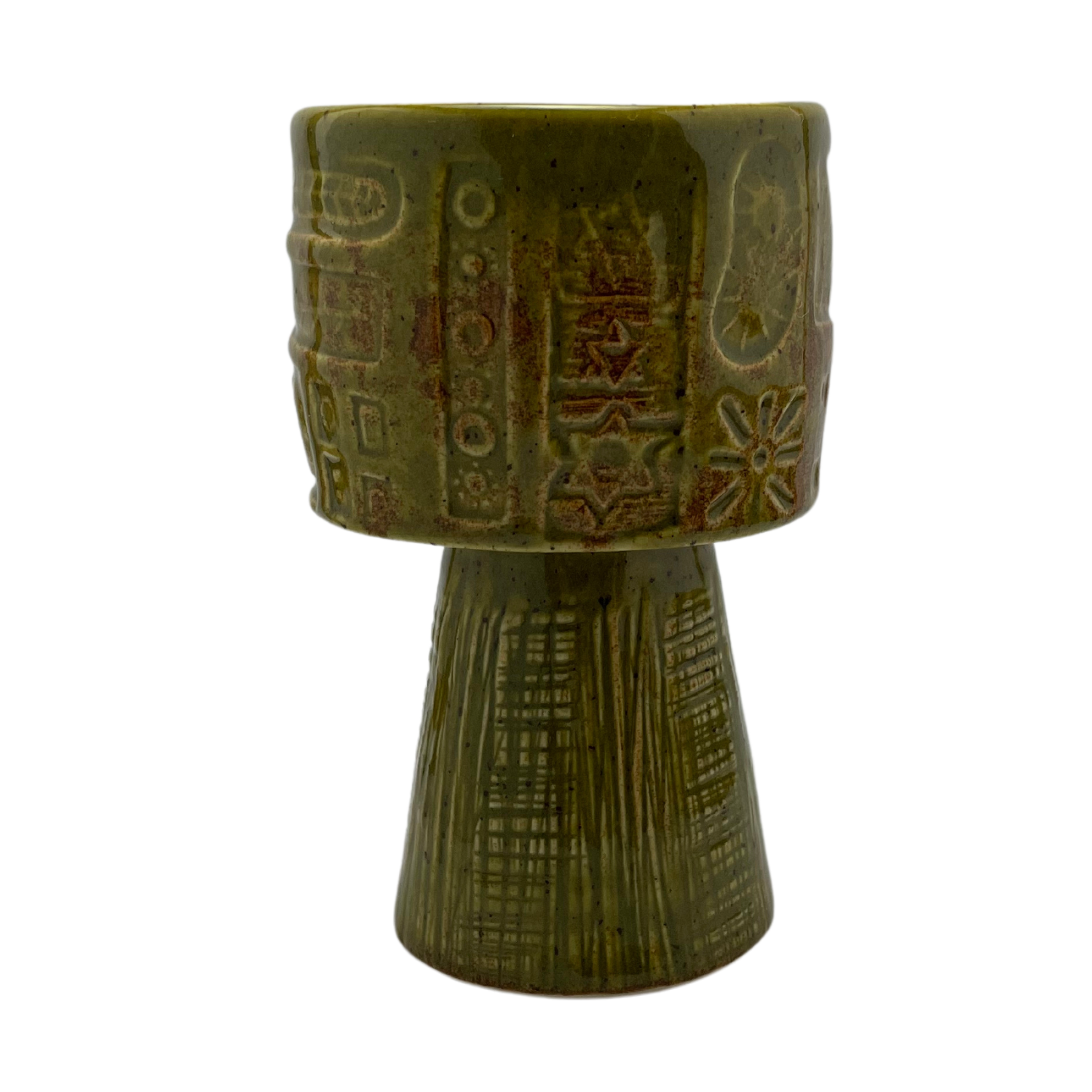 Hand-painted, one-of-a-kind tall Kiddush Cup featuring a distinct surface adorned with Star of David designs. Each ornate cup is crafted to enrich Shabbat through the practice of beautifying Jewish observances. Inspired by mid-century Judaica, this Kiddush cup features a stylized cylindrical shape and a cone base, offering a comfortable and elegant grip.