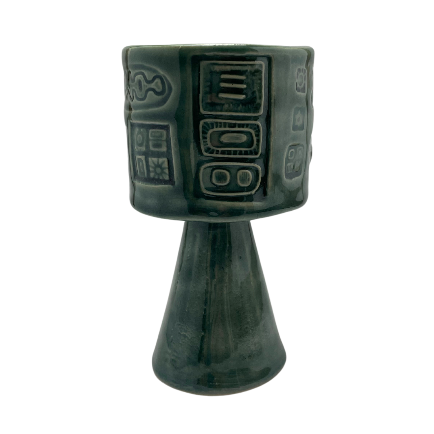 Hand-painted, one-of-a-kind tall Kiddush Cup featuring a distinct surface adorned with Star of David designs. Each ornate cup is crafted to enrich Shabbat through the practice of beautifying Jewish observances. Inspired by mid-century Judaica, this Kiddush cup features a stylized cylindrical shape and a cone base, offering a comfortable and elegant grip.
