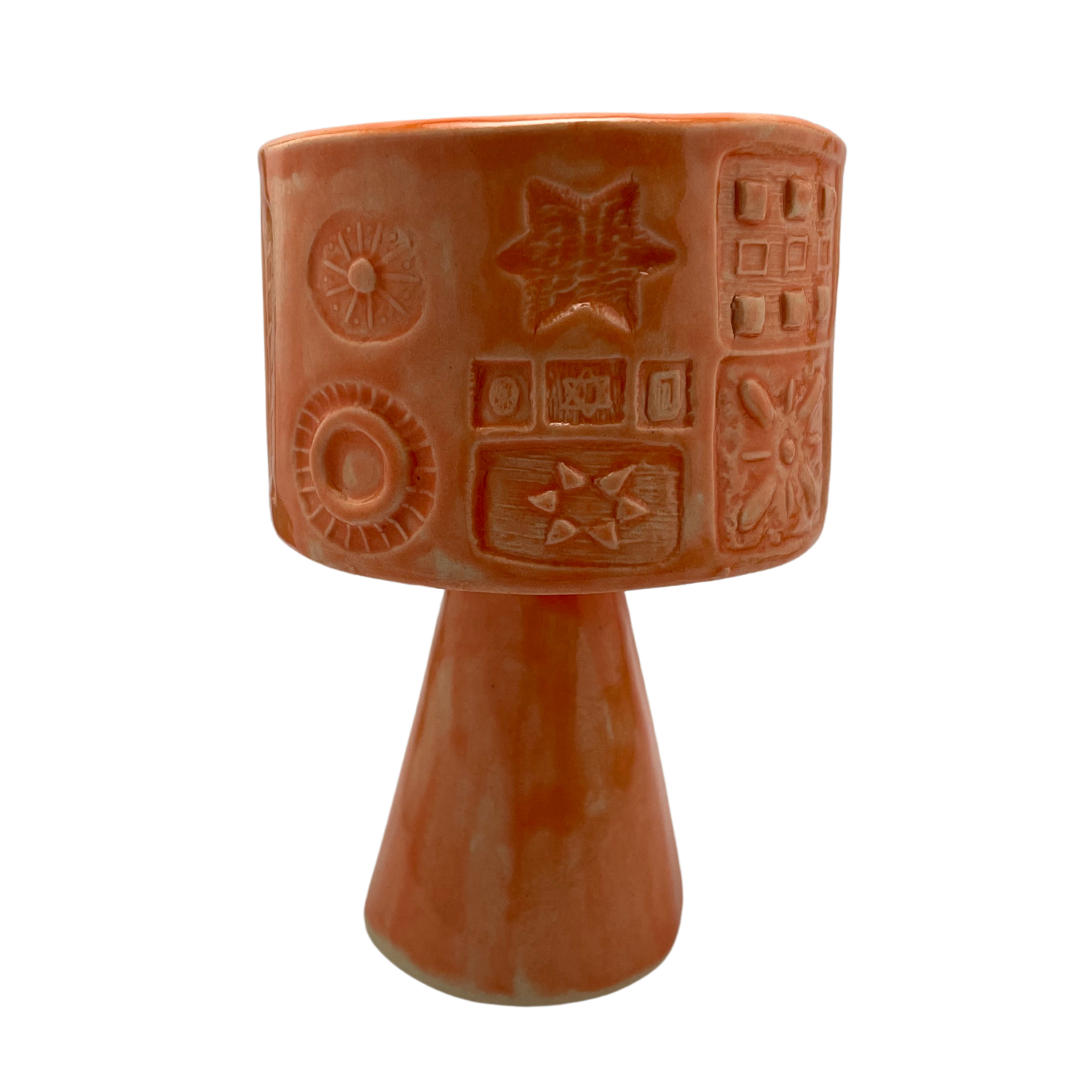 Hand-painted, one-of-a-kind tall Kiddush Cup featuring a distinct surface adorned with Star of David designs. Each ornate cup is crafted to enrich Shabbat through the practice of beautifying Jewish observances. Inspired by mid-century Judaica, this Kiddush cup features a stylized cylindrical shape and a cone base, offering a comfortable and elegant grip.