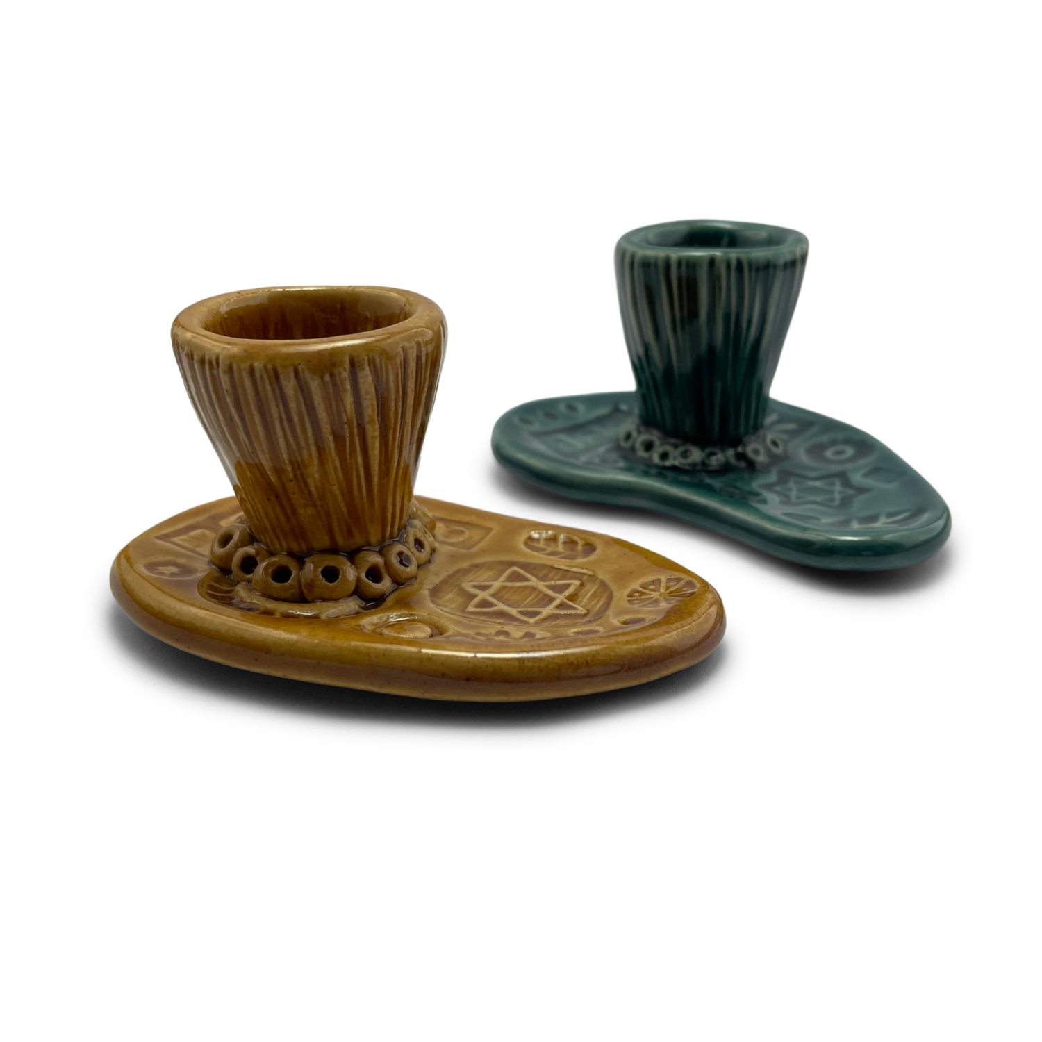 The final step involves kiln firing at approximately 2000°F, which enhances the depth of the glaze and reinforces the ceramic. This meticulous process results in a beautifully crafted and durable Shabbat candle holder set.