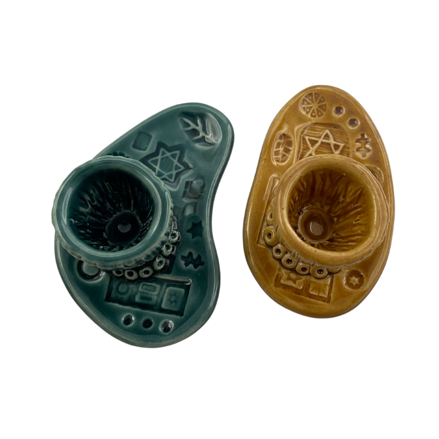 Handmade, one-of-a-kind Shabbat candle holders in mustard yellow and teal blue. Crafted from porcelain-like stoneware clay, the collection of Shabbat candlestick holders is thoughtfully designed to work well together, offering a cohesive aesthetic.