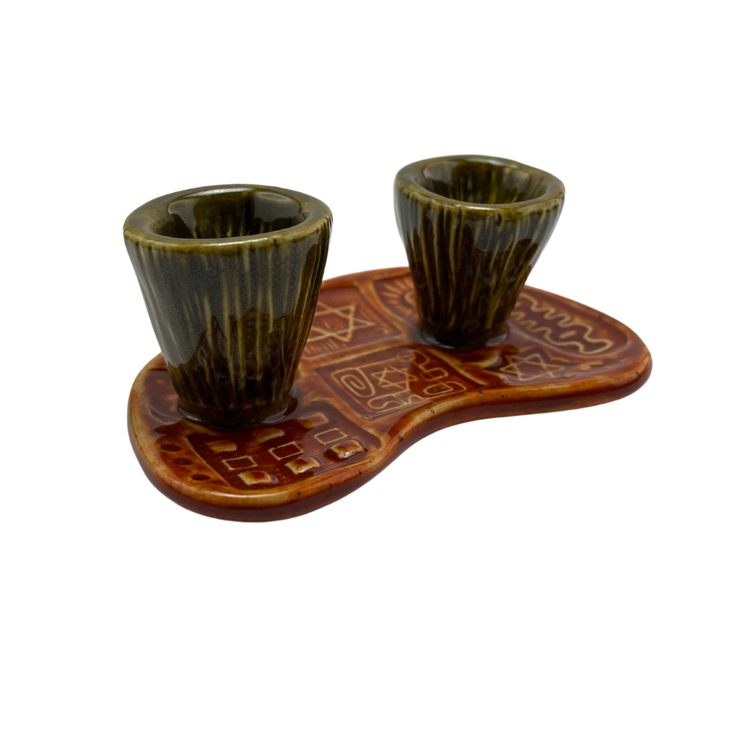 The final step involves kiln firing at approximately 2000°F, which enhances the depth of the glaze and reinforces the ceramic. This meticulous process results in a beautifully crafted and durable Shabbat candle holder set.