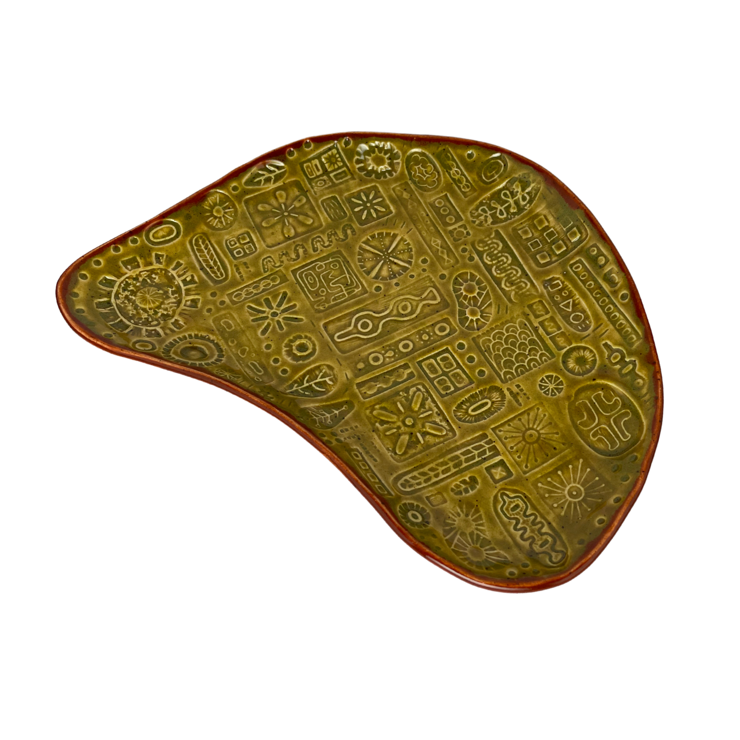 Handmade, one-of-a-kind small retro platter, featuring a green surface with a deep burnt orange rim and sides. Ideal for elevating your table settings as a serving platter for small bites or for use as a decorative catch-all tray. Crafted from porcelain-like stoneware clay, the collection of homewares is thoughtfully designed to work well together, offering a cohesive aesthetic.