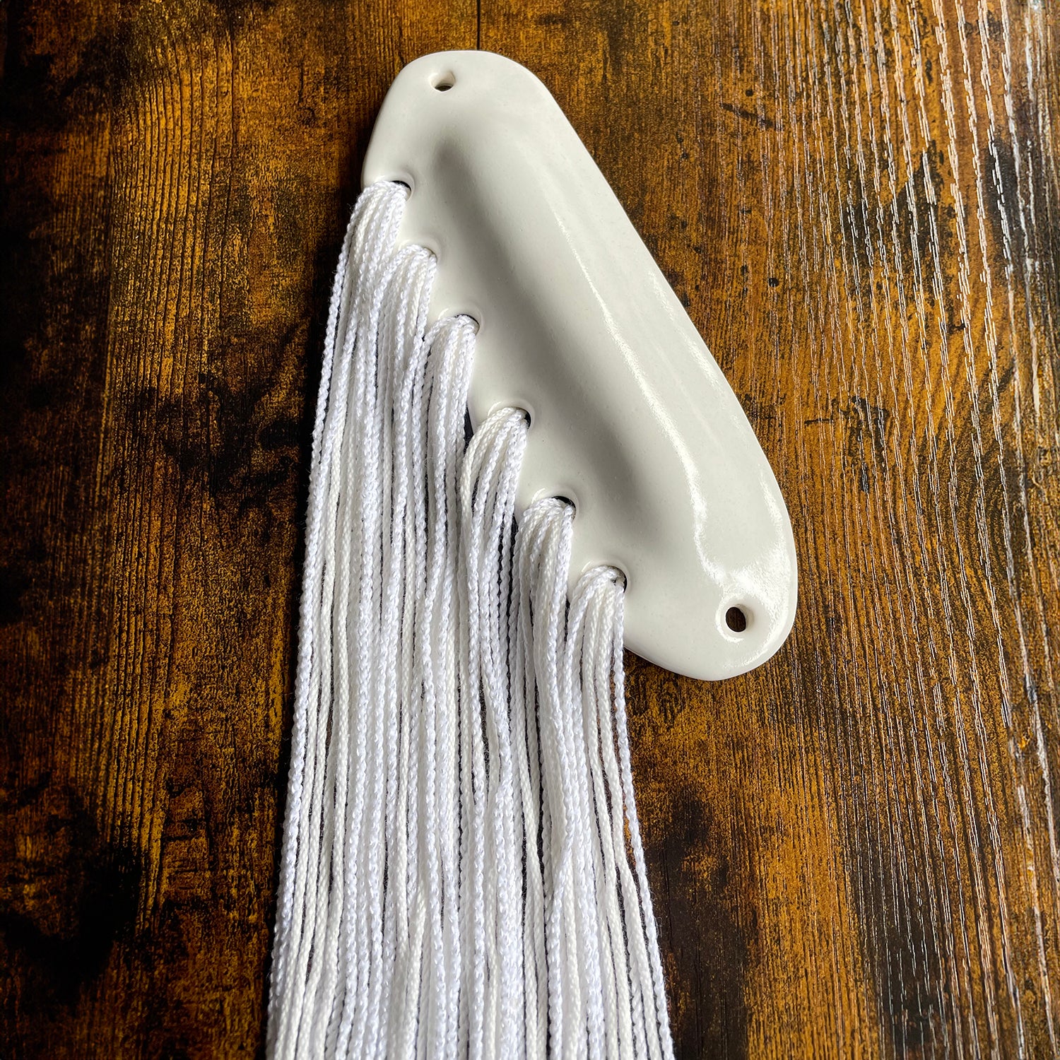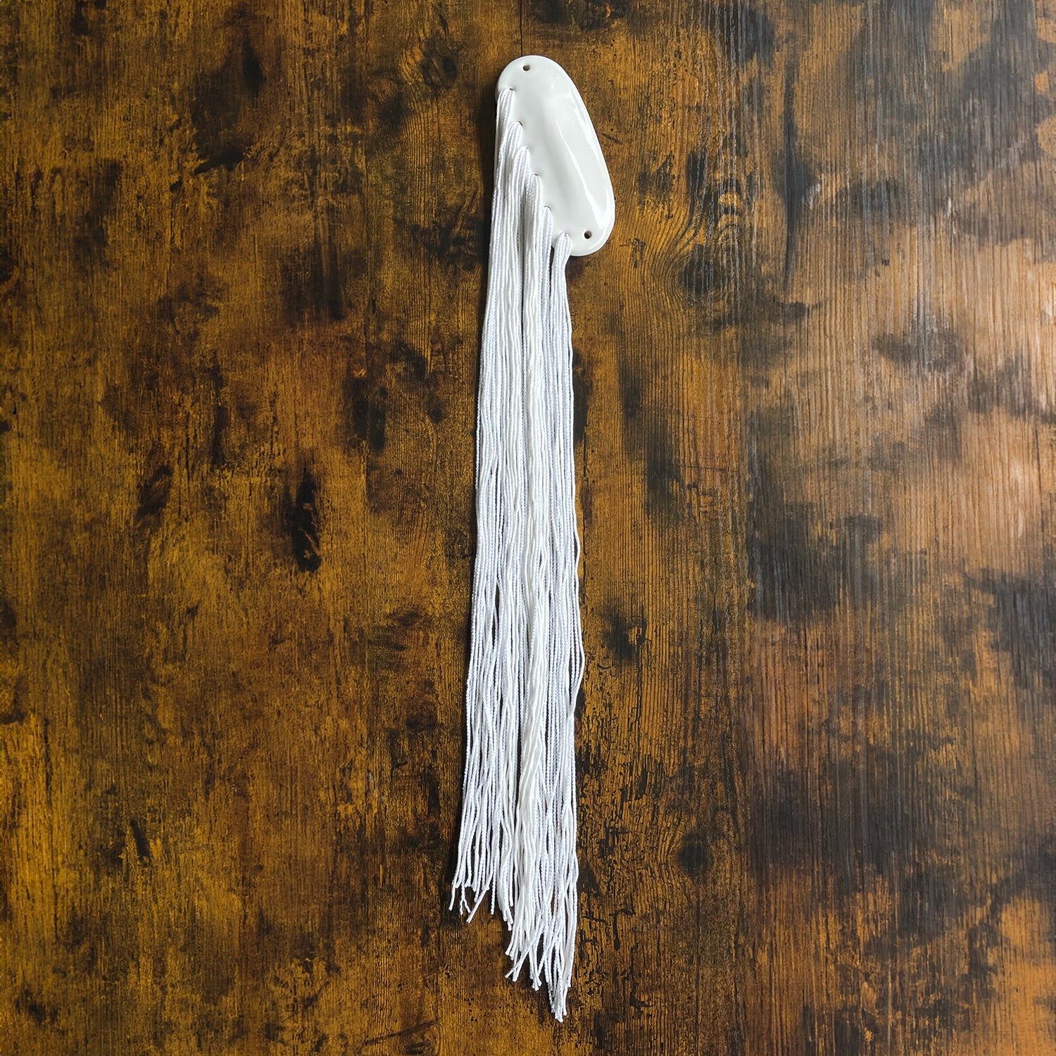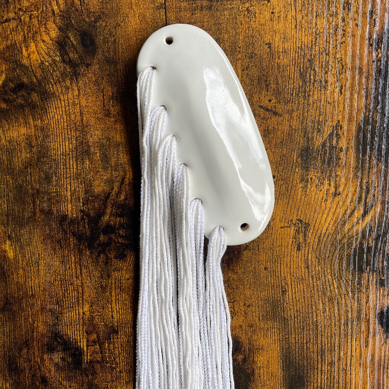 One-of-a-kind textile mezuzah featuring meticulously woven, long strands of fabric intertwined with a handcrafted ceramic body. Shana Ostrowiecki’s original design thoughtfully incorporates strands in multiples of 18, symbolizing life and luck, to create a piece that blends tradition with contemporary artistry. Each mezuzah is uniquely adorned, reflecting Shana’s dedication to elevating Jewish observance through beautiful craftsmanship.